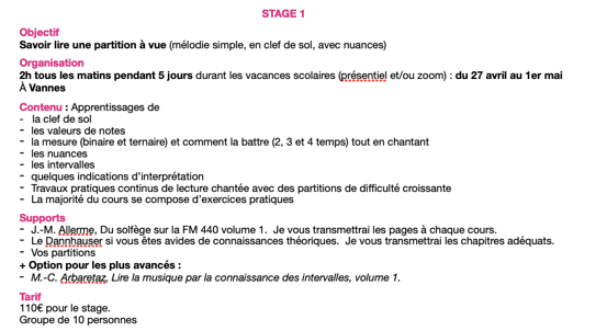 Les cours vous apporteront non seulement un apprentissage ou un approfondissement du chant, de la technique vocale, de la musicalité et de l'interprétation, mais également un travail sur votre identité vocale et/ou musicale.